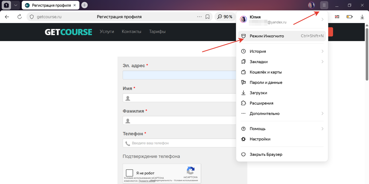 Новому владельцу нужно зарегистрироваться в главном аккаунте GetCourse на странице регистрации. Если по какой-то причине новый владелец не может сделать это сам, вы можете зарегистрироваться от его имени в новом окне браузера в режиме Инкогнито (расположение вызова режима Инкогнито может отличаться в вашем браузере).