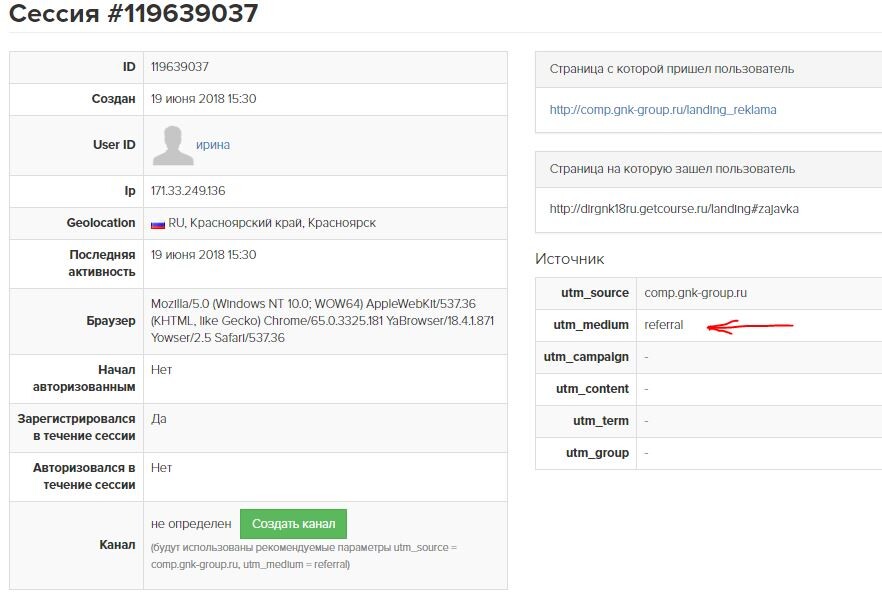 Источник пользователя отображается в профиле. Чтобы подробнее изучить сессию, во время которой пользователь зарегистрировался, кликните по ее номеру.