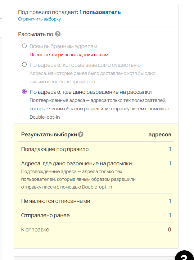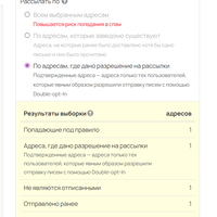 - По адресам, где дано разрешение на рассылки — выбираются те пользователи, которые явным образом разрешили отправку писем с помощью Double-opt-In