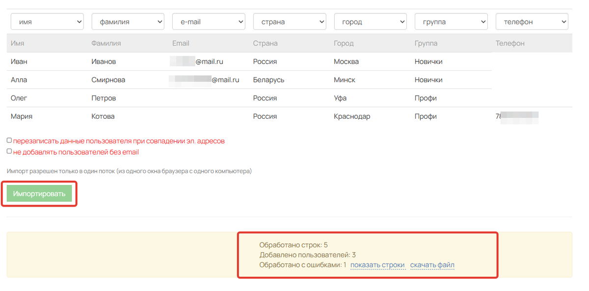 Если такой пользователь есть, то в его профиле обновится только та информация, которая есть в импортируемом файле. Если в профиле указаны ФИО пользователя, а в файле есть колонки только с почтой и номером телефона, то после импорта с перезаписью в профиле появится номер телефона, а ФИО останется неизменным.
