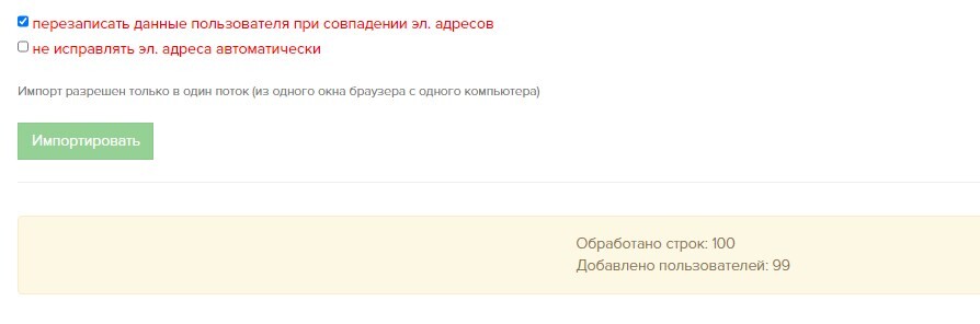 Важно! Для корректного добавления пользователей в группу включите опцию «перезаписать данные пользователя при совпадении эл. адресов» — о ней подробнее расскажем ниже.