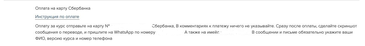 Помимо автоматических платежных решений вы можете настроить собственные способы оплаты, написав подробные инструкции для пользователей. Например, инструкцию для перевода на карту Сбербанка. Созданные способы будут видны пользователям при оплате заказа.