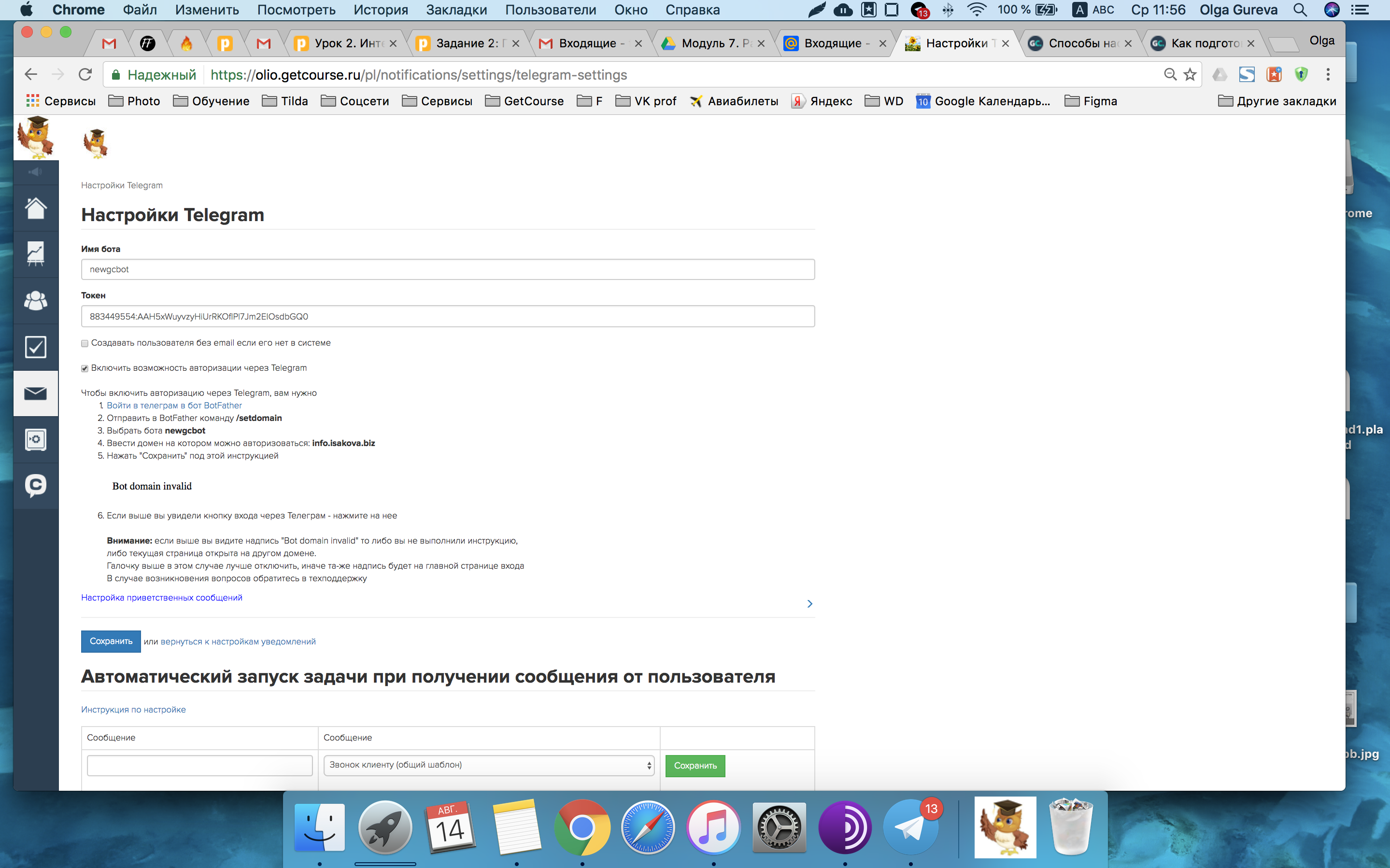 Настройка интеграции с Telegram не зависит от подключения домена в аккаунте.