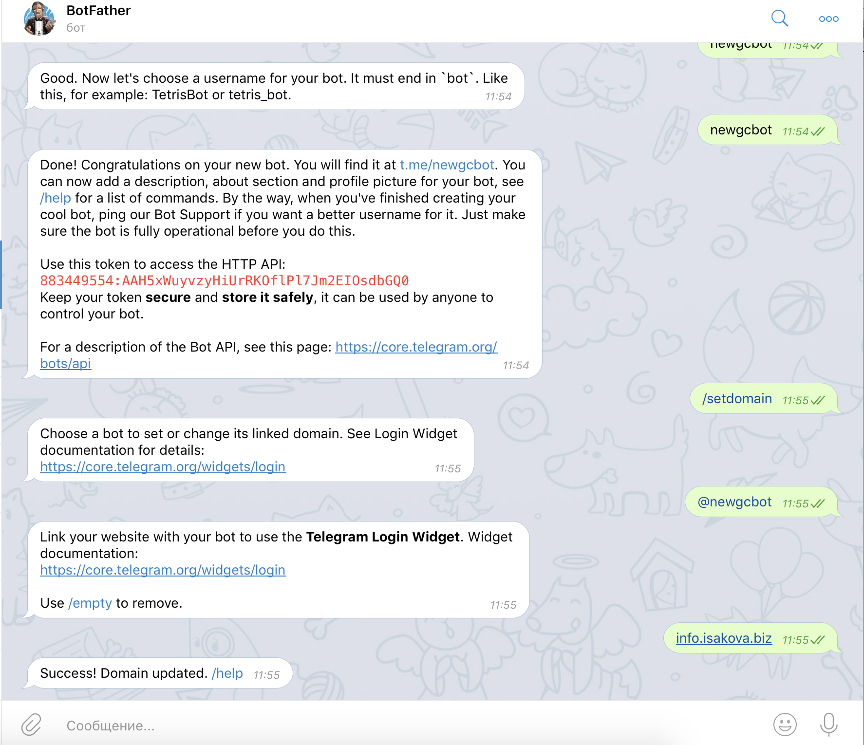 - Чтобы получить токен (6), необходимый для подключения Telegram к аккаунту, задайте имена бота: