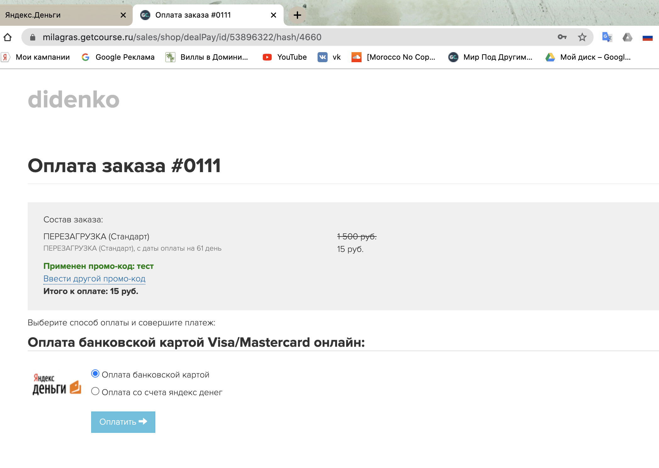- подключен платежный модуль GetCourse Pay;