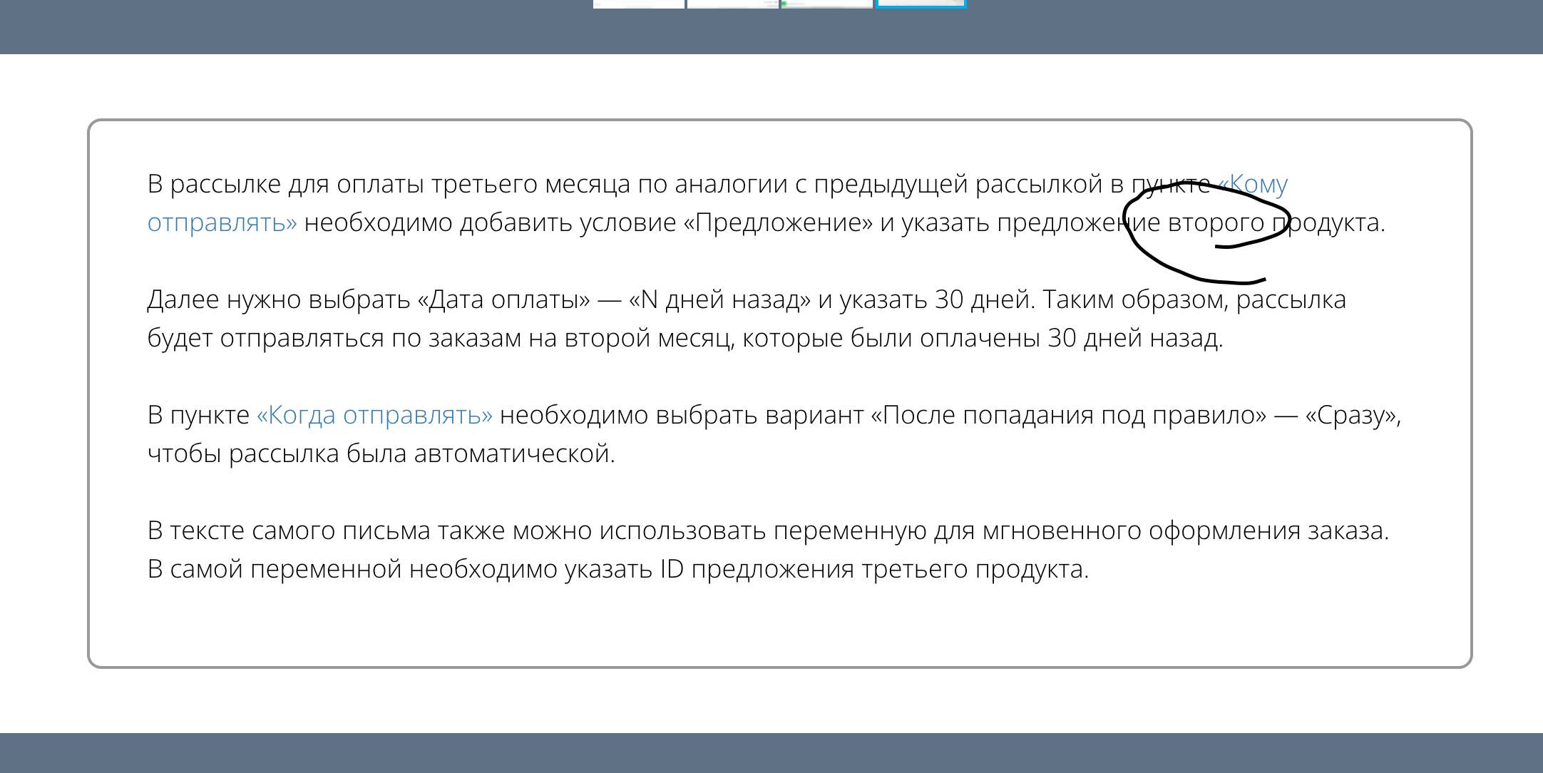 В рассылке для оплаты второго месяца в пункте «Кому отправлять» необходимо добавить условие «Предложение» и указать предложение первого продукта. Далее нужно выбрать «Дата оплаты» — «N дней назад» и указать 30 дней. Таким образом, рассылка будет отправляться по заказам на первый месяц, которые были оплачены 30 дней назад.