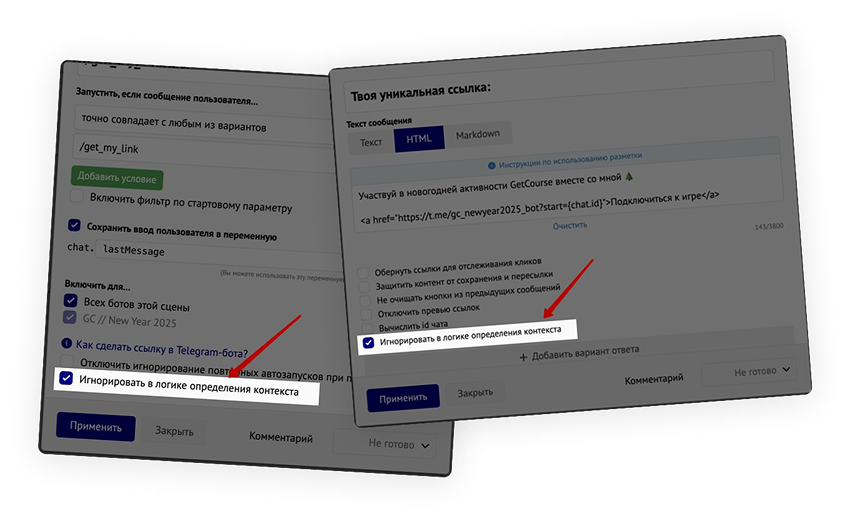 Этот чек-бокс был установлен во всех блоках, которые не относятся к основному сценарию, для сообщений, не предусмотренных основной цепочкой.