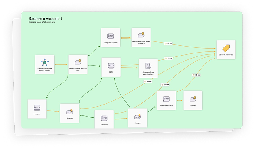Вся микро-воронка и события-триггеры были добавлены на отдельный сценарий. С помощью функции «Продолжить воронку» запускался соседний сценарий, который отправлял сообщение и ждал правильного ответа от участника.