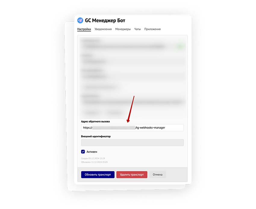 Не обошлось без программирования этой логики. В аккаунте был добавлен адрес, на который должны приходить обновления от канала. В настройках канала мы добавили этот адрес, чтобы все события пересылались дальше.