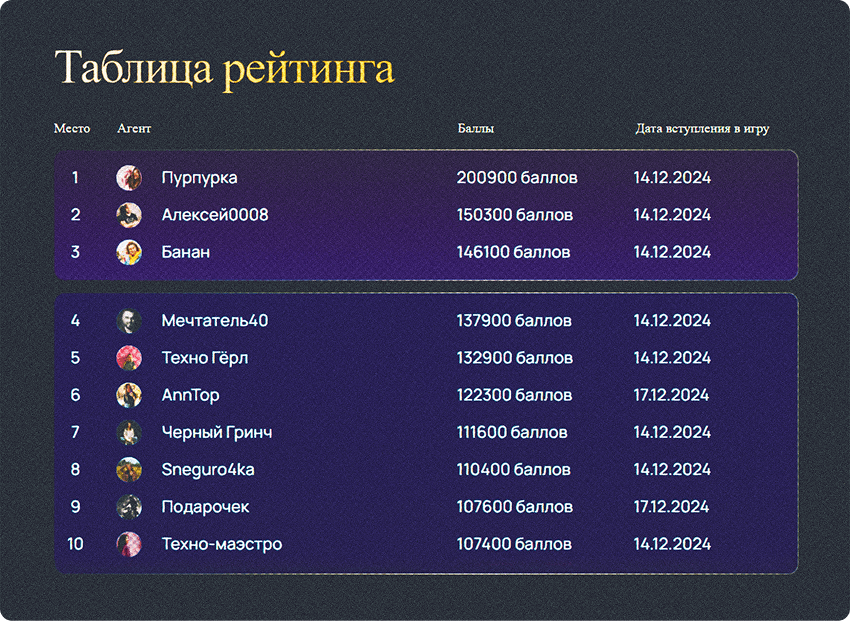 Баллы нужны были не только внутри игры: с их помощью мы создали таблицу рейтинга игроков. Эта таблица также использовалась для сохранения идентификаторов VK и партнеров участников.