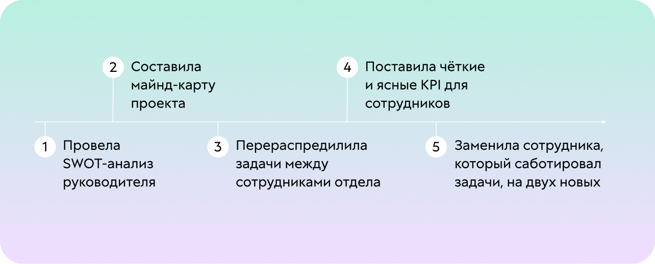 После анализа проекта я предложила ряд изменений, которые могли бы значительно улучшить работу проекта. Мы не сокращали расходы, а выстроили систему для улучшения каждого аспекта работы отдела в несколько шагов.